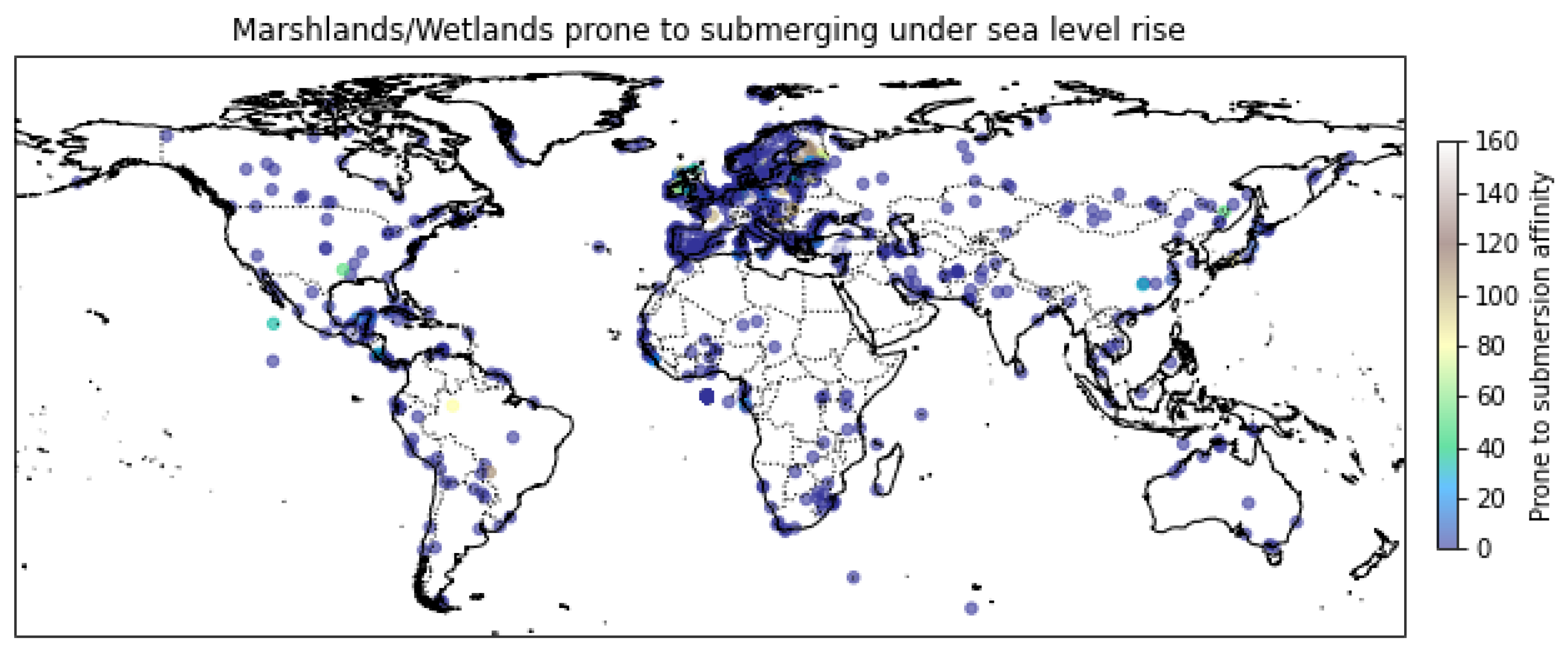 Introduction of a physically grounded submersion score to rank coastal wetland and city vulnerability based on elevation, land cover, and historical inundation frequency.
