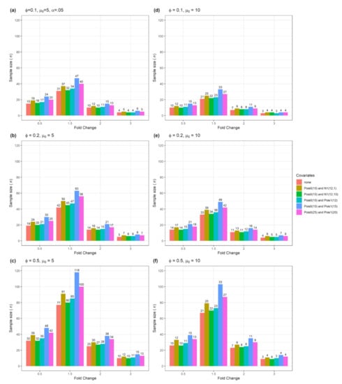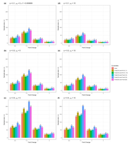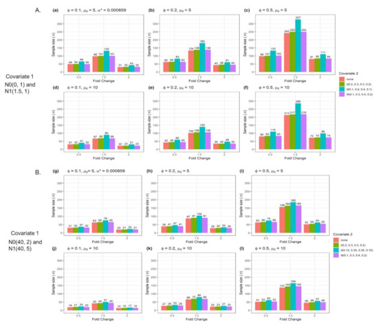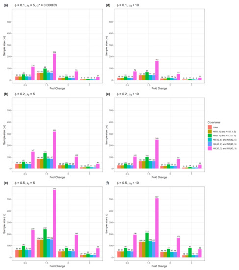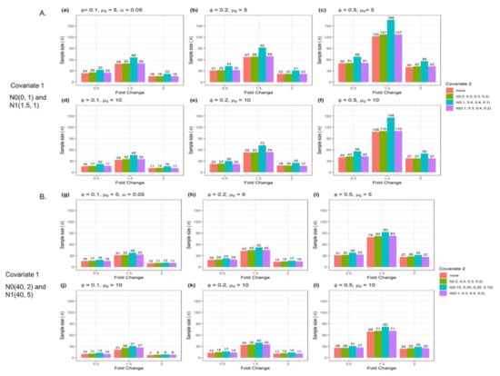 The bar graphs in Figure 1, Figure 2 and Figure 3 illustrate the sample size n versus the fold change ρ with fixed ϕ and adjusted by different covariates for testing a single gene. The actual power calculated from the simulation is ≥ 0.8. The color-coded bars in Figure 1 represent confounding covariates in a normal distribution with equal/unequal mean and variance between two groups. The height of the bars illustrated in the figures represents the number of the sample size. We first observe that the n decreases as the fold change ρ increases from 1.5 to 3, where the ρ of 0.5 indicates a 2-fold down-regulated gene. The figures show that a much larger n is required for the gene that has a fold change of 1.5 compared to a fold change of 2 or 3, which is expected. Given a fixed and ρ, n increases as ϕ increases from 0.1 to 0.5 (Figure 1a–f). This is also expected, which indicates that a larger n is required for a higher variation of samples. We also observed that n decreases as the read count increases from 5 to 10 (Figure 1a–f), given a fixed ρ and or vice versa. Since represents the abundance of gene expression, this suggests that a larger n for a lowly expressed gene is required in order to achieve an empirical power close to 0.80 in the DEG analysis. Furthermore, we need to point out that the values of n are not similar for a fold change of 0.5 and 2 because there is no symmetry between laws in and Given different confounding covariates, similar changes of n for the parameter settings (ρ, and ϕ) are observed in Figure 2 and Figure 3.