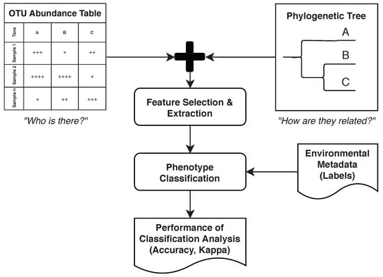 Wassan et al. [29] continued the “Feature Engineering” phase by creating a phylogenetic tree from the OTU table and then using this tree to conduct feature selection using various algorithms, such as random forest (Section 3.4). Figure 2 outlines this idea. For the “Analysis” phase, Support Vector Machines (SVMs) (Section 3.2), naïve Bayes (Section 3.5), and logistic regression (Section 3.6) were compared for classifying phenotypes given in the original dataset.