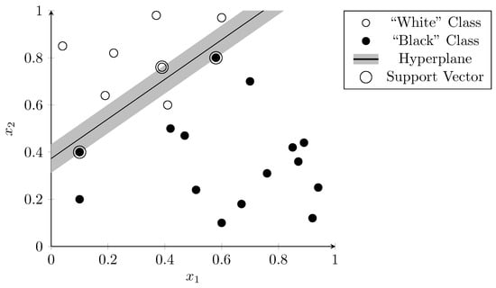 Support Vector Machines (SVMs) [40] are used to separate input data into exactly two distinct classes. This works by computing a hyperplane in the vector space with the largest possible margin between data points of the two classes. A hyperplane is defined as a subspace with one dimension less than the vector space it is contained in. Therefore, in a 2D space, the hyperplane would be a simple line, while in a 3D space it would be a plane and so on.