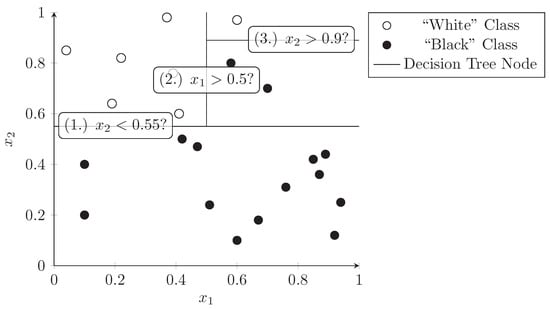A decision tree is a tree structure where each node splits a data set into two subsets based on a predicate (e.g., dimension has a value of 0.5 or less). This process can be repeated at subnodes which divide the dataset further into smaller and smaller subsets. A decision tree can be used as a classifier by assigning class labels to the leaf nodes of the tree. The nodes should be constructed in a way that maximizes the predictive value at each level of the tree, i.e., the dimensions and values should be chosen in a way that best separates the data points into the target classes. Figure 4 demonstrates how a decision tree splits the dataset used in the previous section into distinct subsets that only contain one class of points (black dots or white dots). The lines represent a node in the decision tree and the predicate is written in the label. Each side of the line is a sub-branch of this node and can contain further decision nodes.