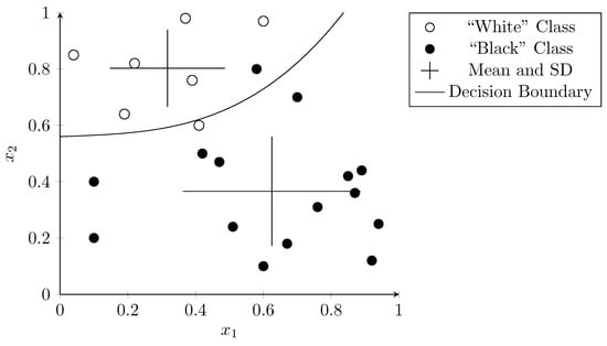 Figure 5 shows an example where the normal distribution for black and white dots was computed and shown as crosses originating at the mean and extending to one standard deviation (SD) in each dimension. The probability that a data point belongs to a class depends on this probability distribution. The curve shows the decision boundary where the probability for both classes is the same. Even though there are two outliers, the overall separation works well and categorizes almost all points correctly. Naïve Bayes is popular because of its simplicity and its capability to perform well with very few training samples.