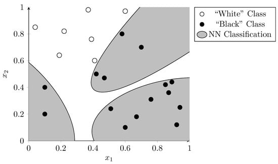 Figure 7 shows the same data points as were used in the previous examples. Here, the dots were used to train a hypothetical neural network. The gray background shows which area is classified as the “black dot” category, whereas the white background shows which are classified as the “white dot” category. The neural network was able to classify all points in the training set correctly. However, it seems unlikely that these irregular areas represent an underlying truth in the data. If the network is overfitted to the data used during training it is likely to misclassify new data points given to it. Intuitively the SVM did a better job at generalization in this example.