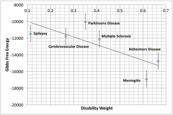 Any measurement of disease activity must, therefore, incorporate the intracellular protein–protein interactions. We introduce a method for interrogating individual tissue expression of mRNA against existing, well-curated PPINs. We focus on proving that thermodynamics, i.e., the molecular changes defined by Gibbs free energy, can be correlated with disease state and progression. Figure 1 shows the correlation of Disability Weight with average Gibbs free energy values for six neurological conditions. The relationship between disease-related disability and Gibbs free energy is linear, with progressively worsening disability correlating with increasingly more negative Gibbs free energy. The respective values used for the figure are shown in Table 1. We confirm that low entropy (less negative Gibbs free energy) for epilepsy correlated with the lowest disability, whereas the higher entropy (more negative Gibbs free energy) in Alzheimer’s disease correlated with the highest disability. These findings correlate well with clinical observations that the severity of neurological dysfunction in multiple sclerosis, bacterial meningitis and Alzheimer’s disease is certainly higher than in epilepsy.