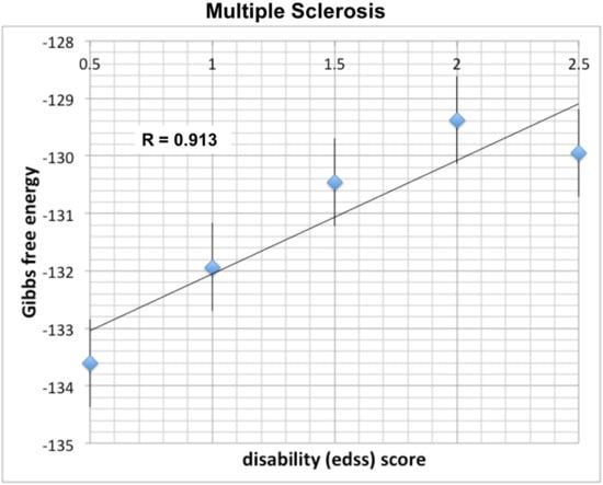 Yet, another scale is used by clinicians for evaluation of disability in multiple sclerosis (MS). The Expanded Disability Status Scale (EDSS) was developed by a neurologist (John Kurtzke) in 1983, and ranges between 0–10. It is based on neurological evaluation of pyramidal (limb movement), cerebellar (ataxia, coordination, tremor), brainstem (speech, swallowing and nystagmus), sensory, bowel and bladder, vision and cerebral (mental) functions. Its 0.5-unit increments represent progressively higher levels of disability. EDSS 1.0–4.5 refers to people with MS who are able to walk without any aid, whereas 5–6 refers to progressive motor and cognitive disability. Similarly to AD, we find a positive linear slope between Gibbs free energy and disability in MS (see Figure 3), as consistent with neuronal loss due to demyelination. The respective correlation coefficient between EDSS and Gibbs free energy in MS was found to be very strong at R = 0.913.
