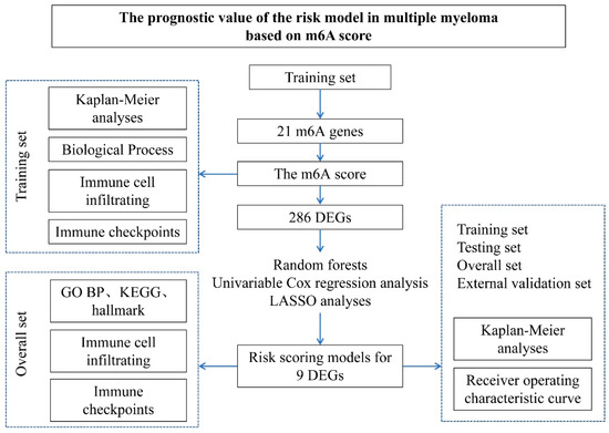 Background: Multiple myeloma (MM) is one of the most common cancers of the blood system. N6-methyladenosine (m6A) plays an important role in cancer progression. We aimed to investigate the prognostic relevance of the m6A score in multiple myeloma through a series of bioinformatics analyses. Methods: The microarray dataset GSE4581 and GSE57317 used in this study were downloaded from the Gene Expression Omnibus (GEO) database. The m6A score was calculated using the GSVA package. The Random forests, univariate Cox regression analysis and Lasso analyses were performed for the differentially expressed genes (DEGs). Kaplan–Meier analysis and an ROC curve were used to diagnose the effectiveness of the model. Results: The GSVA R software package was used to predict the function. A total of 21 m6A genes were obtained, and 286 DEGs were identified between high and low m6A score groups. The risk model was constructed and composed of PRX, LBR, RB1, FBXL19-AS1, ARSK, MFAP3L, SLC44A3, UNC119 and SHCBP1. Functional analysis of risk score showed that with the increase in the risk score, Activated CD4 T cells, Memory B cells and Type 2 T helper cells were highly infiltrated. Conclusions: Immune checkpoints such as HMGB1, TGFB1, CXCL9 and HAVCR2 were significantly positively correlated with the risk score. We believe that the m6A score has a certain prognostic value in multiple myeloma.