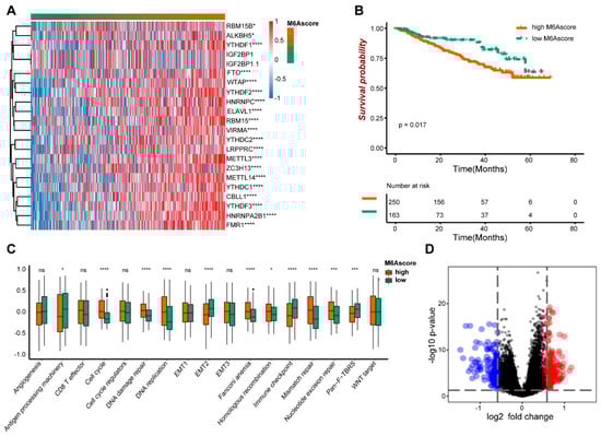 The prognostic characteristics of m6A score. (A) The expression of the m6A gene. (B) The survival analysis of high and low m6A scores. (C) The biological function analysis of high and low m6A score groups. (D) The volcano maps showed different genes between high and low m6A scores. * indicates significant, with the p value less than 0.05, *** indicates p value less than 0.001, and **** indicates p value less than 0.0001.