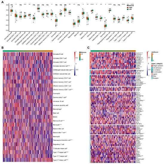 Functional sequencing of prognostic models. (A) Pathway analysis. (B) Immune cell invasion. (C) Expression of immune checkpoints. * indicates a correlation p value less than 0.05, ** indicates p value less than 0.01, *** indicates p value less than 0.001, and **** indicates p value less than 0.0001.