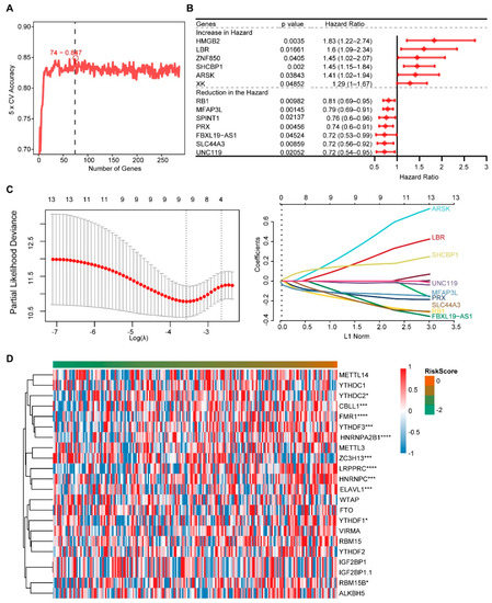 The differentially expressed genes (DEGs) between the low and high m6A score groups were identified by the Limma package in R []. The p values < 0.05 and |log FC| > 1.5 sets were used to determine the immune checkpoint subtypes of DEGs in the significance standard []. Then, the Random forest in the machine learning method of the Caret package was used for gene dimensionality reduction, and Univariate Cox regression analysis was applied to determine representative genes. The prognostic genes and their Lasso regression coefficients were obtained by selecting the highest lambda value (“min” lambda) through 1000 cross-validation in the training set using the Lasso method. The risk score is the sum of the expression value of genes screened by LASSO * the regression coefficient of LASSO. * represented a multiplication symbol.