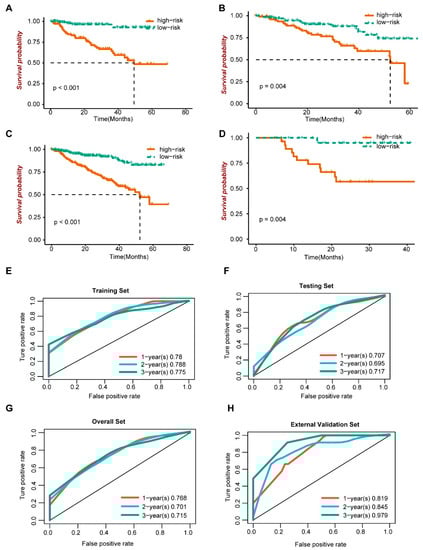 We further evaluated the prognosis of the risk score model. In the training set (Figure 5A), the validation set (Figure 5B), the overall data set (Figure 5C) and the external validation set (Figure 5D), the survival analysis showed that patients with the high-risk score had a poor prognosis, with p values less than 0.05. Then, the effectiveness of the risk score model was evaluated in the training set (Figure 5E), the verification set (Figure 5F), the overall data set (Figure 5G) and the external verification set (Figure 5H). Among them, in overall sets, the sensitivity at 1, 2 and 3 years was 0.557, 0.557 and 0.671, respectively; the specificity was 0.823, 0.823 and 0.704, respectively; the accuracy was 0.772, 0.772 and 0.697, respectively; and the AUC was 0.768, 0.701 and 0.715, respectively. The time-dependent ROC curve analysis showed that the model is effective.