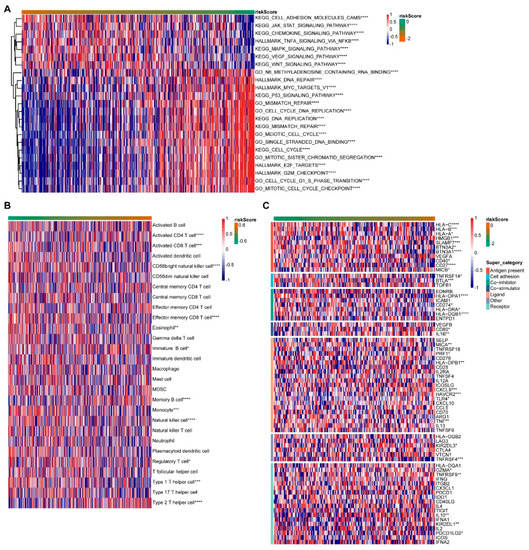 Then, in the GO BP (Biological Process), KEGG and Hallmark gene concentration, we used the GSVA R package to conduct related pathway analysis for the risk score (Figure 6A). As the risk score went up, the Cell adhesion molecules cams, the JAK-STAT signaling pathway, the TNFA signaling pathway and the MAPK signaling pathway all decreased. The DNA repair, the MYC targets V1, the P53 signaling pathway, the Cell cycle DNA replication, the DNA replication, the Meiotic cell cycle, the Cell cycle, the Mitotic sister chromatid segregation, the G2M checkpoint, the Cell cycle G1 S phase transition and the Mitotic cell cycle checkpoint increased. The higher the risk score is, the worse the patient’s survival rate is. It was suggested that the above pathway is related to the poor survival of patients. The immune cell infiltration was ranked according to the risk score from low to high (Figure 6B). The Activated CD4 T cell, Memory B cell and Type 2 T helper cell significantly increased with increasing risk scores. The Activated CD8 T cell, CD56 bright natural killer cell, Effector memory CD8 T cell, Monocyte, the natural killer cell and Type 1 T helper cell decreased significantly as the risk score increased. The immunization checkpoint was ranked as the risk score goes from low to high (Figure 6C). The levels of HLA-C, HLA-B, SLAMF7, BTN3A1, CD27, BTLA, HLA-DPA1, HLA-DQB1 and TNFRSF4 decreased significantly with the increase in the risk score, while HMGB1, CXCL9 and HAVCR2 increased.