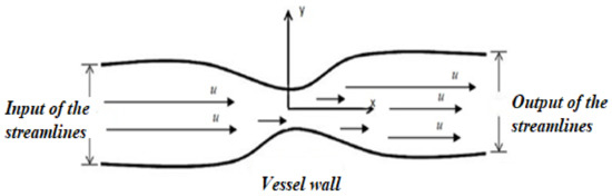 In the “no fall” condition placed at the boundary, fluid in contact with the vascular wall can pass at the same pace as the wall. This is because the shear forces imposed by the wall on the fluid will ultimately cause the boundary flow to have the same velocity as the downstream surface, which is a rational statement in this analysis. Meanwhile, to preserve mass equilibrium, the flow away from the vessel wall continues to speed up until it reaches an established profile, where no further velocity profile changes occur in the flow direction. This causes a non-zero speed gradient,, where u and y are the velocity component in the direction of flow and the coordinate of the space perpendicular to the direction of flow, as shown in Figure 1.