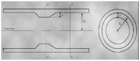 The amount of cross section that is “blocked” by occlusion determines the degree of stenosis. The narrowest segment (called “groove”) of the blockage is usually considered the cross section for stenoses with variable geometry. Figure 3 depicts a common model of a tube with a single stenosis in which the original radius of the vessel R0 is obstructed by a stenosis with a normalized maximum height of value = h/R0, where h is the maximum height of the stenosis. To obtain the unit length, the available radius, R0 = 1. Because the standardized height of the stenosis must be 0 ≤ δ <1, we can deduce the following [23].