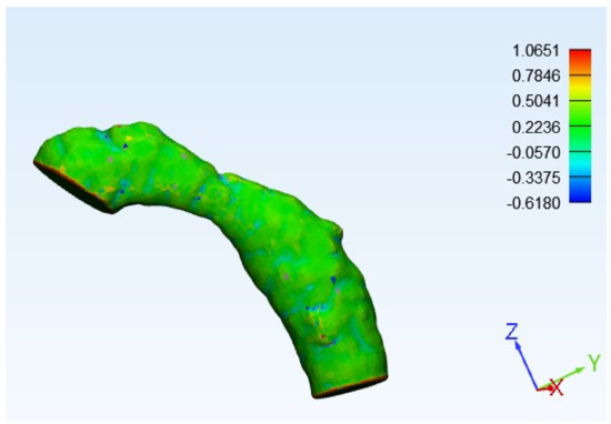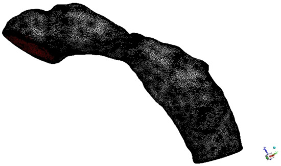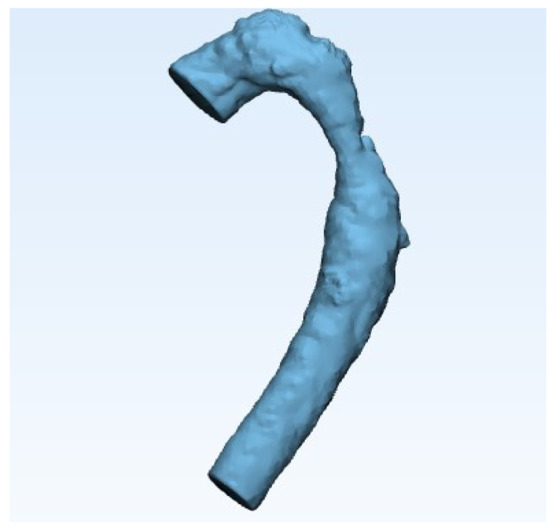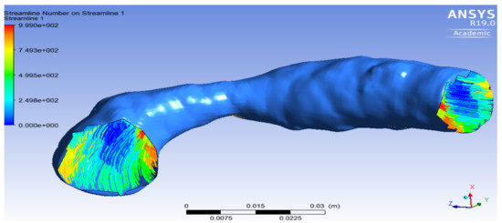Owing to the fiber of this model, the fluid flow is deflected, resulting in a sinuous orientation of the flow lines, which shows a three-dimensional flow around the wall of the aorta, mainly directed from the inlet to the outlet. The area of stenosis in the middle, indicated by lower speeds, is shown in Figure 21.