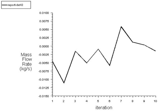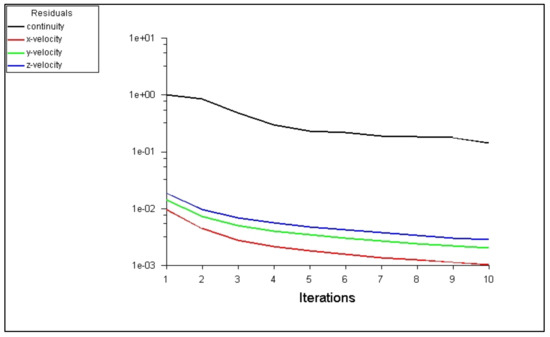 To solve the 2D Navier–Stokes equation, the configuration of this fluid solver is based on the pressure with absolute velocity formation in a stable time. Our fluid is blood with a density of 1056 (kg/m3) and a viscosity of 6 (kg/m3). The boundary condition must be zero for the aortic model. The execution of the laminar flow model defines the velocities and pressure in the viscous flow field (the Navier–Stokes equation) to solve the displacement of the internal facet of the 3D model of the aorta. During the resolution during the first 10 iterations, the velocity residuals along the three axes (x, y, z) are estimated in Figure 15.