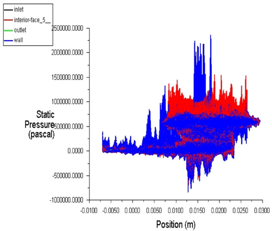 The dimensions of velocity and pressure are combined in the momentum that governs the fluid equations. The coupled and independent methods are the two primary methods for solving discrete time equation algebraic equations. The simultaneous solution of the velocity and pressure parameters characterizes a coupled system. However, it is not commonly used in technical problems, owing to its poor processing power and high memory requirements. Coupled methods are commonly used for calculating compressible flows, whereas separate methods are favored for calculating incompressible flows. Unlike a coupled solution, a single approach solves the velocity and pressure fields independently or sequentially. It has the benefit of reducing computer memory and processing time, making it more effective for studying incompressible environment simulation fluids, as in our case for aortic stenosis modeling [36]. The pressure analysis of the proposed model is shown in Figure 16.