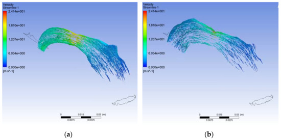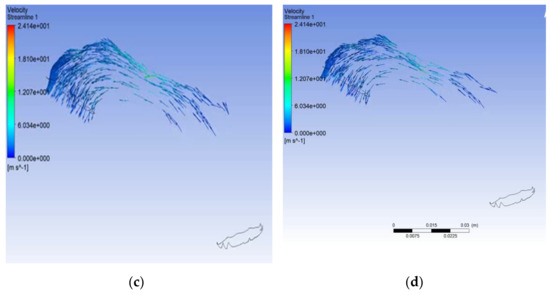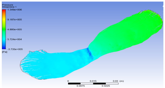 Focusing on the velocity in the stenosing part, we noticed that the flux field lines were delayed and decreased from 6.034 to 1.207 to . Interestingly, the detection of negative pressure in the value narrowing zone was −3.735 , as shown in Figure 22.