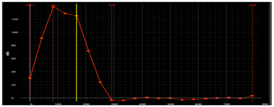 where i represents the pixels within the vessel’s outline, and j represents the spatial orientation of the pixels relative to the location of the center of the vessel. This method is described in more detail in the literature [39,40]. The flow displacement was calculated for the maximum systolic phase only, as shown in Figure 24. The maximum systolic phase was determined for each transmitter plane and determined using the time slot at the top of the 2D graph. The maximum systolic phase was indicated as a marker of phase slider. A description of the measurements is presented in Table 6.