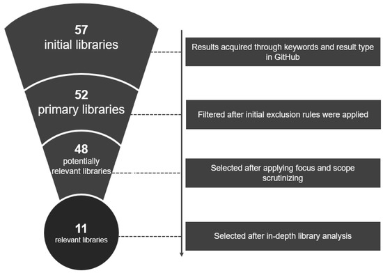 Applying the method described in the previous section, 52 relevant repositories were identified. Moreover, several overview repositories in the topic of xAI have been identified. These overview repositories provided information on the libraries other than ones identified through initial scan and were further used for backward and forward search. Next, a process resembling abstract and conclusion scan was conducted to filter out the libraries not focused on xAI and/or VA. In other words, documentation from repositories and implementation of the libraries were scrutinized to identify their focus and scope. As a result, 48 libraries were selected as relevant. These libraries were analyzed, interpreted, and summarized in a concept-centric way [42]. Through an in-depth analysis, metadata was collected, and core libraries and frameworks were identified for further exploration. Figure 1 provides an overview of the process.