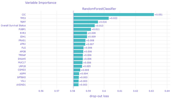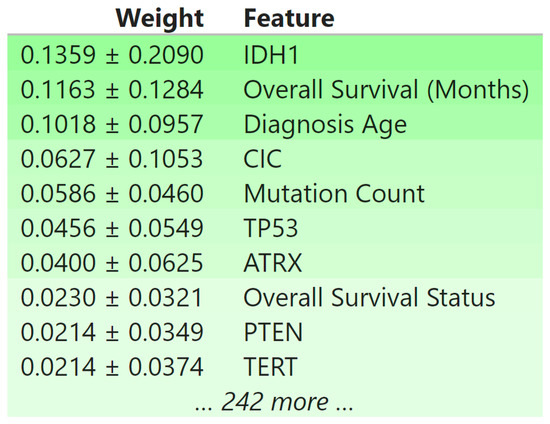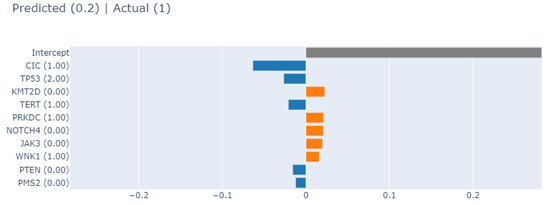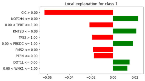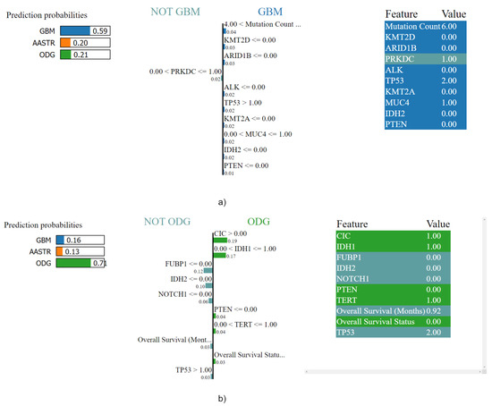 Figure 10a,b show instance explanations of LIME. These figures provide explanations for an instance prediction on the class of GBM or ODG, respectively. There are three parts of LIME visualization: a class description with an accurate prediction for each class, a plot showing the impact of features, and a table with actual values in the instance. The left-most section displays prediction probabilities. For the multi-class classification task, we have three colors, blue (GBM), orange (AASTR), and green (ODG). The middle section returns the most important features. The impact of features helps the user to understand which features values are supporting class prediction positively (right side) and which features values are not supporting prediction (left side). If we take Figure 10a as an example, features are represented in two colors: blue and light sea-green. The blue bars indicate supporting (positive) scores towards an instance being predicted as GBM, while the light sea-green bar indicates contradicting (negative) scores towards its prediction. Float point numbers on the horizontal bars represent the relative importance of these features. We can see in Figure 10a that the highest positive influence have genes CIC, BCL6, PKD1L1, and ATRX.