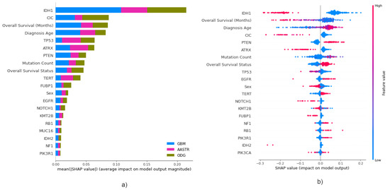 From a biomedical point of view, many of the important variables highlighted by the various xAI methods are already known to be involved in cancer signaling and represent common biomarkers in glioma. Generally, such insights into the model can be used for validation. The transcriptional repressor CIC is part of the tyrosine kinase signaling pathway which is known to be involved in tumorigenesis, especially in GBM [51]. Other gene features impacting the classification include mutated IDH1, ATRX, TP53, PTEN, TERT, NF1, and EGFR, all of which are known to be involved in DIFG [22,52]. Among important variables are also the mucin protein family (MUC16 and MUC17) which are involved in epithelial barrier formation and potential biomarkers for favorable prognosis in DIFG, or lysine methyl transferase (KMT2B) also shown to be a player in gliomagenesis [53,54]. One example given, the type I transmembrane protein Notch 1 receptor (Notch1), is involved in the NF-B signaling pathway effecting cancer development and progression, especially in GBM [55]. Notch 1 is listed in the global top 20 variables listed by SHAP, but not by Dalex. Still, in SHAP it distinguishes primarily between ODG and GBM. Some gene mutations are not primarily common for one class of sub disease, but can increase or mitigate cancer malignancy as given by the example of IDH1. Mutated IDH1 will lead to a favorable outcome, but a complete genetic profile could tell more of cases not concordant with standard prognoses [56]. In the case of local explanations as given in Figure 10b, IDH1 is selected in favor of the ODG class. Local explanations can thereby support further insight on individual cases instead of presenting the big picture of global classes.