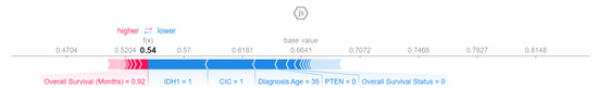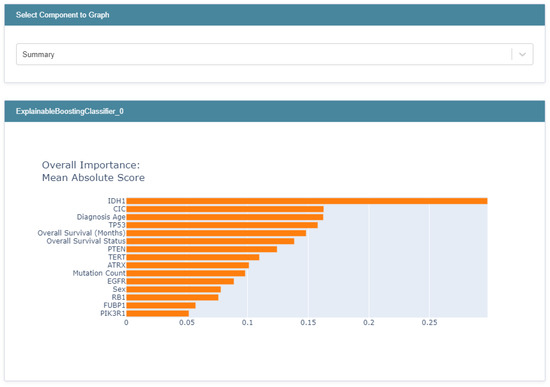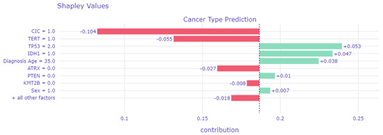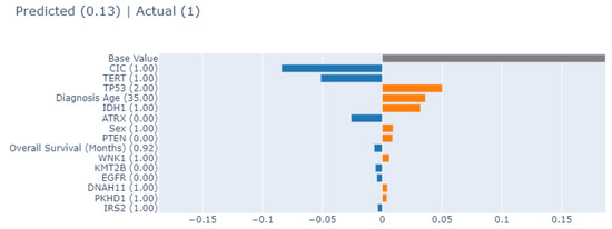 The evaluation of features affecting the classification between the diffuse glioma (DIFG) of Glioblastoma multiforme (GBM), Anaplastic Astrocytoma (AASTR), and Oligodendroglioma (ODG) highlights various mutated genes and clinical variables depending on the underlying xAI method. Diagnosis age and survival are among the most important predictors all of the methods, followed by varying gene mutations. Capicua (CIC) depicts an important feature in all approaches and is the most valuable gene feature in Dalex, second in SHAP and InterpretML, and fourth in ELI5. Mutated IDH1 is among the top features and, from a clinical point of view, commonly used for survival prognosis in patients suffering from glioma [34]. Further important variables highlighted by the different xAI methods in different order also include other biomarkers used for clinical classification of glioma, such as ATRX, TP53, TERT, PTEN, or EGFR. Local explanations show a partly different picture and detail decisions of the algorithms on local examples. We present Figures on local instances on the class of GBM (Figure 7, Figure 9, Figure 10 and Figure 11) and (b) ODG (Figure 10). Variables changed place in the hierarchy of importance, while there is additional information on a particular variable’s prediction impact shown as negative or positive factor towards the particular class of the local view.