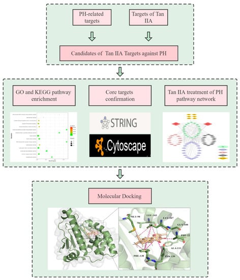 Network pharmacology is a powerful tool in illuminating the drug-target-disease network and generates new ideas and methods for research on medicinal plants [6]. Therefore, we investigate the therapeutic effects of Tan IIA in PH using network pharmacology, then preliminarily verified therapeutic targets by using molecular docking. Figure 1 shows the flowchart of this study.