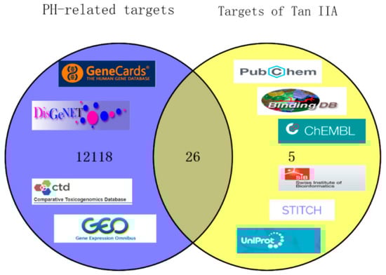 Based on the data structure and algorithm, we obtained 31 potential targets of TIIA and 12,144 genes related to PH after deleting the redundant data. There were 26 overlapping targets that were filtered out as candidate genes of Tan IIA for the treatment of PH by using the online tool VEENY2.1 (https://bioinfop.cnb.csic.es/tools/venny/) (accessed on 20 April 2022), and they were thoroughly analyzed, as is shown in Figure 2.