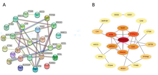 The intersecting protein targets of Tan IIA and PH were identified by STRING platform (https://cn.string-db.org/) (accessed on 21 April 2022). Cytoscape software v.3.7.1 (https://cytoscape.org/) (accessed on 1 August 2022) and plug-in Cytohubba were used to analyze the interaction network and the hub targets in the PPI network [7].