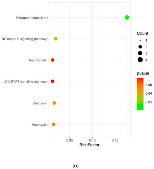 GO analysis and KEGG pathway analysis of the Tan IIA target. (A) Biological process; (B) cellular components; (C) molecular function; (D) KEGG pathway. The color and size of each bubble represent the p value and gene count, respectively. The X-axis is a rich factor representing the ratio of differentially expressed proteins (DEPs) over the total number of proteins in each category.