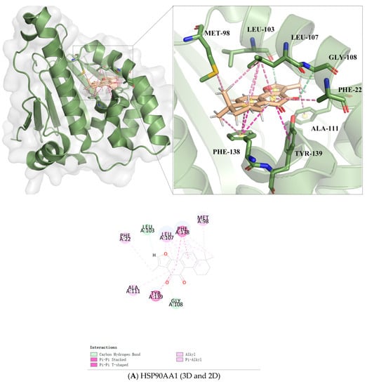 As shown in Figure 5A, the carbon hydrogen bond could combine Tan IIA with GLY108 and LEU103 in HSP90AA1. In addition, there were Pi-alkyl interactions with PHE22, ALA111, LEU107, and PHE138, respectively. Tan IIA could form Pi-Pi stacked with PHE138 and TYR139 in HSP90AA1 and interact with HSP90AA1 via Alkyl with LEU107 and MET98.