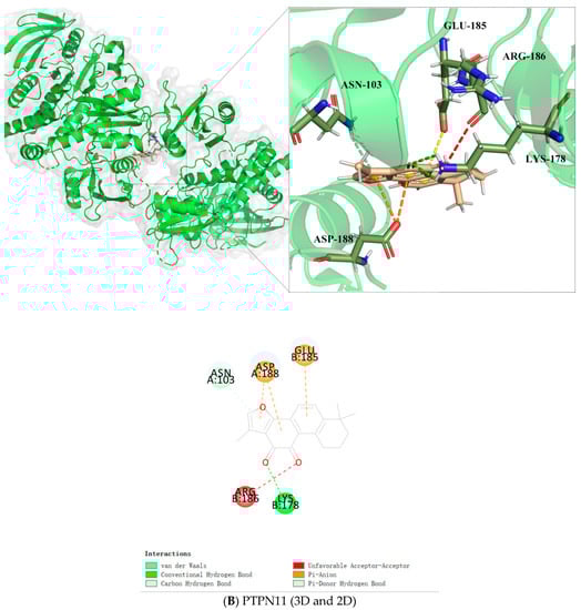 Tan IIA interacts with PTPN11 through conventional hydrogen bond with residues LYS178; Pi-donor hydrogen bond with ASN103; Pi-anion with ASP188 and GLU185, respectively; and unfavorable acceptor-acceptor with ARG186 (Figure 5B).