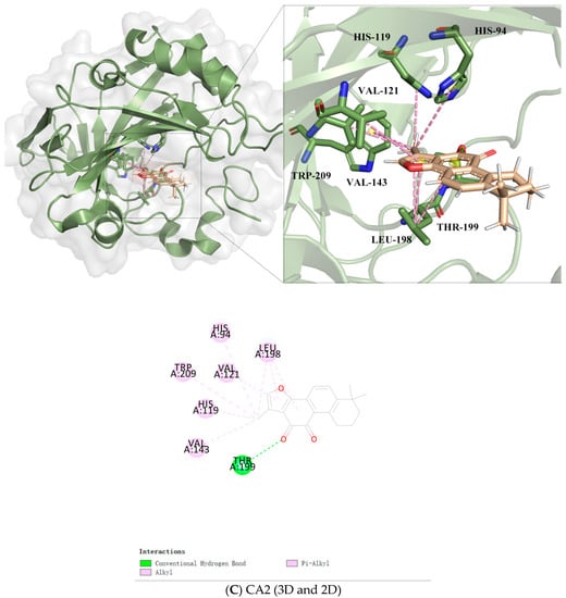 Similarly, the Tan IIA-CA2 was stabilized by a conventional hydrogen bond with residues THR199; Alkyl with VAL143 and LEU198. The structure of Tan IIA was linked to HIS199, HIS94, TRP209, VAL121, and LEU198 through Pi-Alkyl, respectively (Figure 5C).