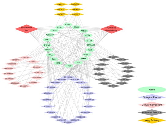 To obtain a comprehensive understanding of the potential mechanisms of Tan IIA on PH, we constructed a “component-target-pathway” network (Figure 6). The network revealed that Tan IIA treated PH through multiple targets and pathways.
