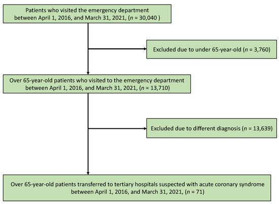 The primary outcome was emergency catheterization performed at a tertiary hospital. We confirmed whether emergency catheterization was performed by checking the response letters from the tertiary hospitals.