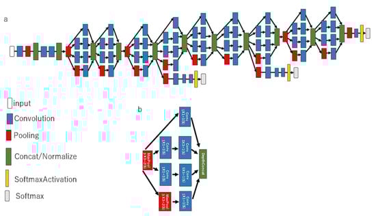 The architecture of a CNN model in GoogLeNet. The pretrained CNN comprises a 22-layer DNN, both (a) implemented with a novel element dubbed an inception module and (b) implemented with batch normalization, image distortion, and RMSprop, including a total of 4 million parameters.