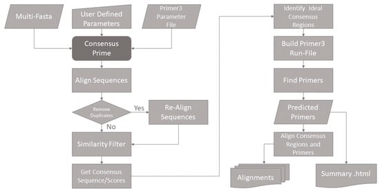 Our new pipeline combines custom alignment filters with MAFFT (v7.453) [8] and Primer3 (v2.5.0) [9], two familiar and long-established tools to ensure high-quality alignments and, respectively, primer predictions. An overview of the pipeline is given as a flow diagram in Figure 2.