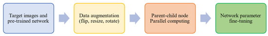 where denotes the error function for the sub-dataset . In this way, all child nodes compute updated weights and biases and transfer them to the parent node. The parent node updates the parameters of the network by processing the results transferred by the child nodes and again broadcasts the updated parameters to each child node, where child node resumes network training using its local data . This procedure is repeated until the training process is finished. When the accuracy is not improved for several iterations, the learning rate is reduced by a factor of 10 to further optimize the network parameters. Finally, the network parameters are fine-tuned for a few epochs to generalize the gradients and obtain optimal convergence.