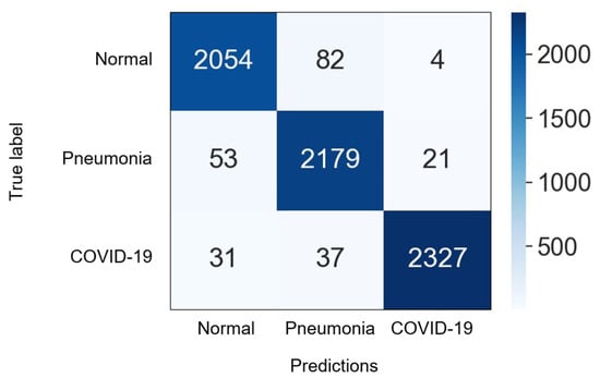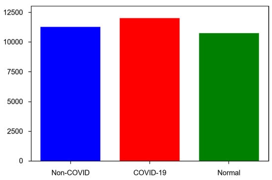 Since the first case of novel coronavirus COVID-19 in December in China, it has infected 230 countries and led to 640,273,401 new cases and 6,615,322 deaths worldwide []. It also affected the world economy, overall healthcare, and the lives of every individual. Due to its highly contagious nature, the overall control of the virus outbreak has been challenging and there have been rapid infections in public. The main symptoms of COVID-19 are sore throat, cough, fever, pain in the chest area, and shortness of breath. Sometimes it can also lead to several severe complications such as induced pneumonia and acute respiratory distress syndrome (ARDS) []. With the help of mass vaccinations being used around the world, the prevention of COVID-19 has improved to a certain degree. The Reverse Transcription Polymerase Chain Reaction (RT-PCR) test, commonly known as a PCR test, has become a common practice to diagnose the COVID-19 virus. Initially, individuals had to go to hospitals or specialized local laboratories to get PCR tests. Nowadays, it has become one of the gold-standard methods and with the help of PCR special kits, individuals can get tested quickly and easily at home anytime, especially when suspicious symptoms arise. However, such PCR tests alone are insufficient in diagnosing the virus due to high false negatives when get tested at home. Additionally, the test shows positive or negative results and cannot classify the complications of the virus such as pneumonia or ARDS. Differentiating COVID-19-infected pneumonia and other viral or bacterial pneumonia types is important to effectively fight against the disease and/or implement preventive measures in healthcare. Latency in the treatment can lead to death or different complications such as reduced lung functions and the development of chronic non-communicable respiratory diseases including chronic obstructive pulmonary disease or asthma [,,]. Early diagnosis and treatment of pneumonia in children are especially important since it is the major cause of childhood mortality []. In practice, chest imaging modalities are used to diagnose and classify different types of COVID-19 symptoms and their complications. Such imaging modalities include ultrasound, magnetic resonance imaging (MRI), computed tomography (CT) scan, and chest tomography (X-ray). Among them, ultrasound is mostly used in children because it is less affected by crying and body movement [,] and also less costly than other modalities. However, ultrasound images are unable to visualize the whole lung and cannot identify consolidation when it is deep in the lung parenchyma []. Additionally, the spleen in the stomach can sometimes be misinterpreted as lung consolidation []. CT scanning is more reliable in many cases but not recommended for routine diagnosis and for children and pregnant women due to high radiation risks. It is also an expensive imaging modality and is sparsely available in many local hospitals and healthcare centers []. MRI can be used to avoid the radiation risks of CT scanning [,]. Moreover, due to a cross-sectional imaging technique, MRI is useful to identify severe cases of pneumonia. However, MRI scanning is challenging with children who are too young to cooperate [,], and more than often sedation or anesthesia is required, which is highly discouraged. Moreover, the sparse availability of expert radiologists in local healthcare facilities to interpret the MRI results makes it less usable on many occasions. X-ray is one of the common practices for diagnosing many lung-related diseases due to its availability in many countries and healthcare facilities. It is also cheaper and faster compared to CT and MRI. However, unlike MRI imaging modality, X-ray is a two-dimensional image and offers less information in general. In this work, we use X-ray images dataset as it is primarily used to diagnose COVID-19.