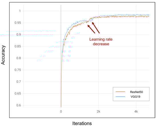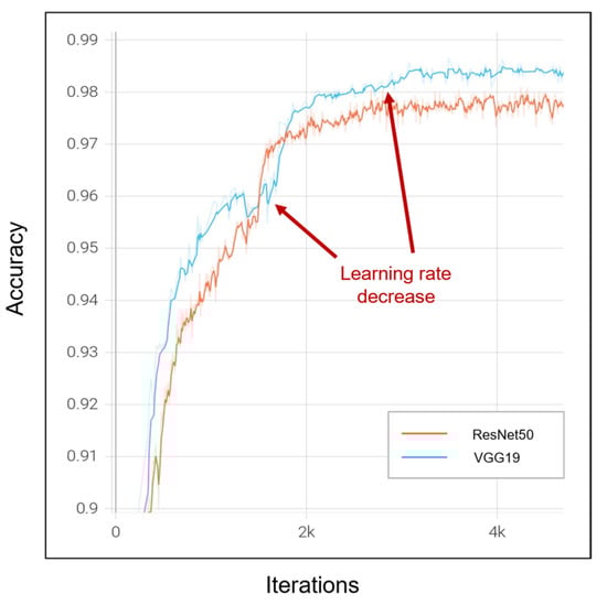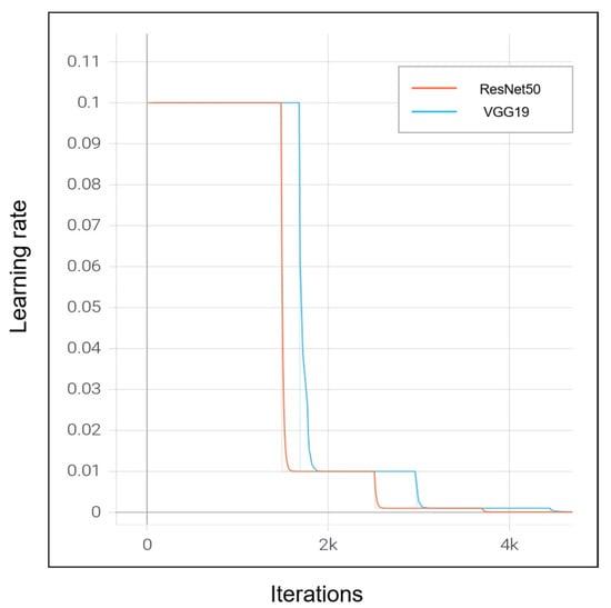The VGG19 model achieved the best training accuracy of 98.75%, whereas ResNet50 achieved 98.02%. In the plots, sudden jumps highlighted in red refer to the learning rate decrease. In our proposed CAD model, the learning rate is decreased by a factor of 10 if the model does not improve accuracy for a while. The learning rate change plots for VGG19 and ResNet50 models are shown in Figure 8, where the learning rate for both models decreased three times. However, the learning rate for ResNet50 decreased earlier, which indicates that the VGG19 model improved for more iterations compared to ResNet50. This can also be seen in the training accuracy plots, where the convergence of VGG19 is better than ResNet50.