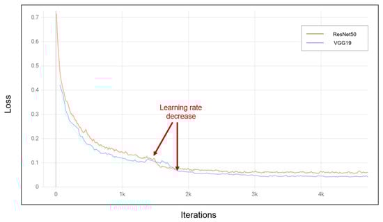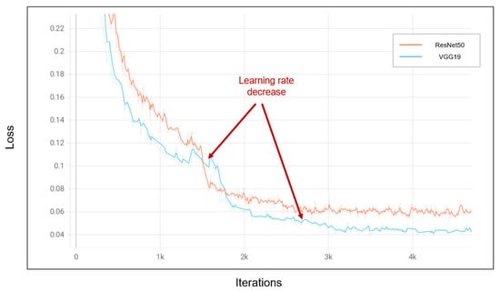 A scaled training loss plots of VGG19 and ResNet50 models. The red arrows refer to the learning rate decrease which result in sudden change in the loss function.
