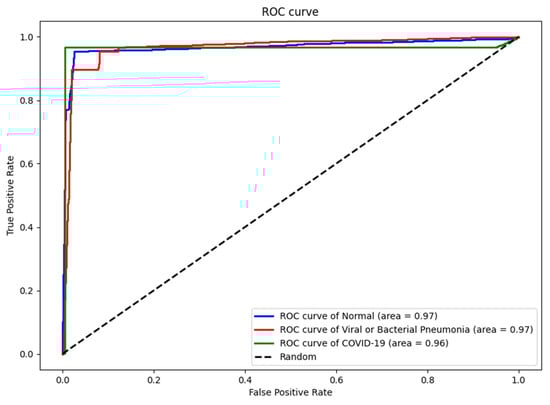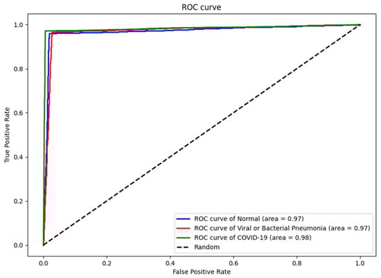 In the next experiment, we evaluate the performance of the ResNet50 model using 6788 test X-ray images. Figure 13 and Figure 14 show a confusion matrix and ROC curves for the ResNet50 model on the test dataset, respectively. From Figure 13, it is seen that the model correctly classified 96.6% of COVID-19 test samples, 95.4% of non-COVID pneumonia test samples, and 95.5% of normal (uninfected) test samples, achieving 95.8% of average classification accuracy across all classes, which is 0.8% lower than the average classification accuracy of VGG19 model. Similar to the VGG19 model, the rate of misclassification as COVID-19 in the ResNet50 model is very low which indicates a high precision score of 0.99 for COVID-19 (the same as VGG19). In comparison to VGG19′s 74 cases, 104 cases of non-COVID pneumonia were misclassified, where 86 of these cases were classified as normal and 18 cases were classified as COVID-19. Although the number of misclassifications is higher in total, in ResNet50, fewer cases of non-COVID infections were misclassified as COVID-19. A total of 81 cases of COVID-19 were misclassified, of which 49 of them were classified as normal and 32 cases were classified as non-COVID infections. Moreover, the lines in the ROC curve shown in Figure 14 are not as straight as those of VGG19 which indicates that the confidence scores for the predictions are lower than that of VGG19. This means, VGG19 not only outperforms ResNet50 in terms of accuracy of correct classification but also does it with higher confidence.