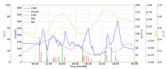 Representative subject’s data: CGM [mg/dL] (blue); CHO intake [g] (green); insulin doses [u] (red); PAI [a.u.] (purple) and SSI [a.u.] (yellow) vs. Time of the day [HH:MM].