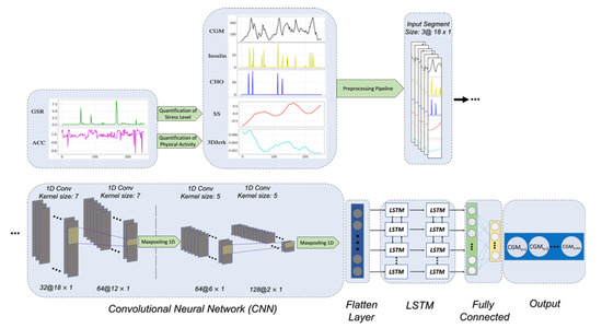 The architecture of the proposed CNN-LSTM model. Raw ACC and EDA signals are used to estimate PAI and SSI features, respectively. Then, these generated features, along with the CGM, insulin, and CHO signals are passed through the preprocessing pipeline.