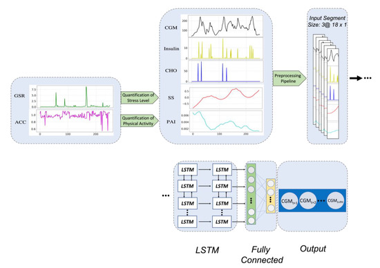 The architecture of the proposed LSTM model. Raw ACC and EDA signals are used to estimate PAI and SSI features, respectively. Then, these obtained features, are combined with the CGM, insulin, and CHO timeseries and are passed through the preprocessing.