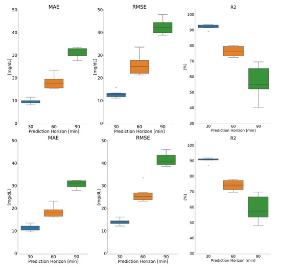 We employed training sets of all patients for population-wise analysis, and then test sets of all six individuals for performance evaluation in order to forecast future BG values for an unknown data sample. The model was trained on three distinct PHs, namely 30, 60, and 90 min. Table 2 and Table 3 show the performance of the proposed LSTM and CNN-LSTM algorithms for different scenarios in terms of MAE [mg/dL], RMSE [mg/dL] and R2 [%] metrics, respectively.