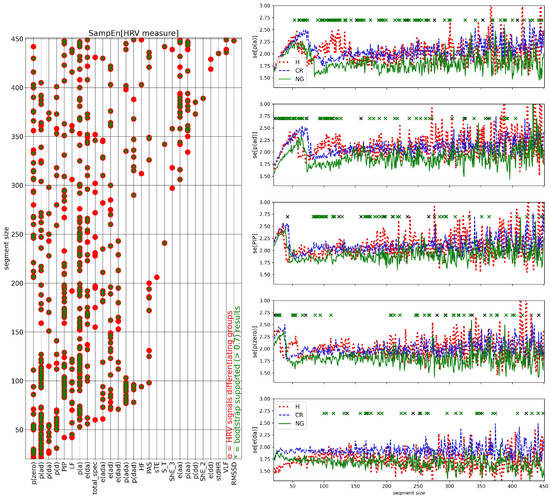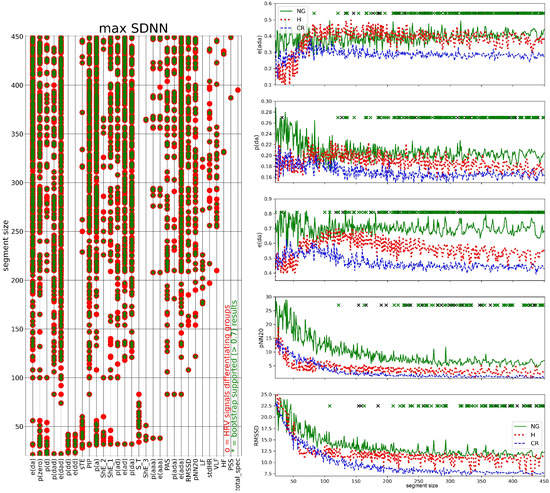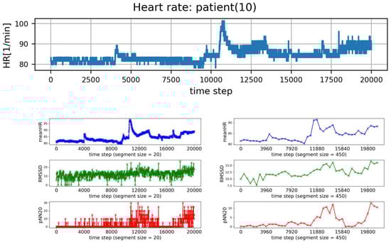 The analysis of HRV windowed sequences can be at least twofold. Firstly, one may be interested in segments with a specific value of a given HRV measure. For example, one can focus on segments that correspond to the slowest meanHR, see Figure 1. After extracting a segment with a given property from a recording, the other HRV measures are estimated for that segment as in the routine HRV analysis. Additionally, one can observe how the results change with the window size. On the other hand, the properties of the sequence of HRV values obtained from successive windows can be investigated. For example, the variability or distribution of this series can be studied. However, in the case of a time series, not only the occurrence of a value is interesting, but in what sequence it occurs. There are many complexity measures that can be used to extract the such information [,].