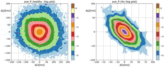 In the following, we propose using the method closely related to the Poincaré plot, which is the well-grounded method of visual assessment of RR intervals []. In the Poincaré plot, each value of the original time series is plotted against the value immediately following . However, in the case when one point on this plot represents many pairs, the information about the point density is lost. By plotting counts of the repeated pairs, the obtained 3D Poincaré plot recovers the lost information []. If the arguments of matrix P are arranged with increasing s then the matrix can be visualized as the 3D Poincaré plot where each describes the probability that an event occurs in the signal of RR increments. A similar representation used to visualize the transition matrix and entropic matrices provides the general information of event availability while the system executes the event in question.
