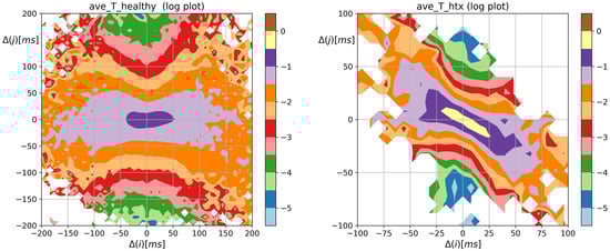In Figure A1, we show the means of probability matrices , where two events, i.e., and then , may occur sequentially in a typical RR increment signal belonging to the HTX patient group.