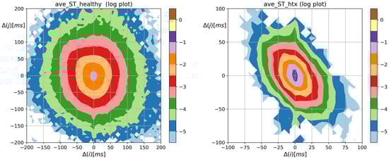 The other differences between the group dynamics became apparent when signals corresponded to extreme situations, to events that were far from typical ones. For example, in Figure A2, one may compare the diversity in the transition distributions after RR increments of a magnitude that is 48 ms or greater. The H group displayed the greatest variability here.